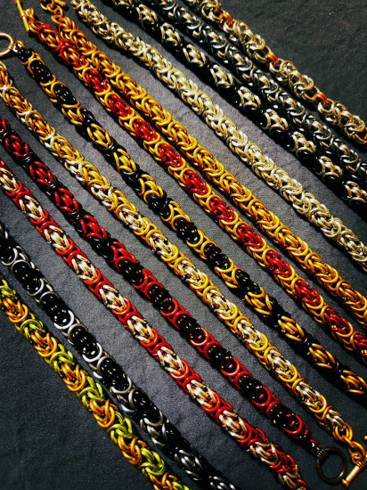 This is probably the first complex pattern I started doing. Its known as the Byzantine chain, but I also like to call it the idiot's chain because after a few minutes, your brain begins to feel like its been sucked through a straw on something that should be simple. A variety of colors.