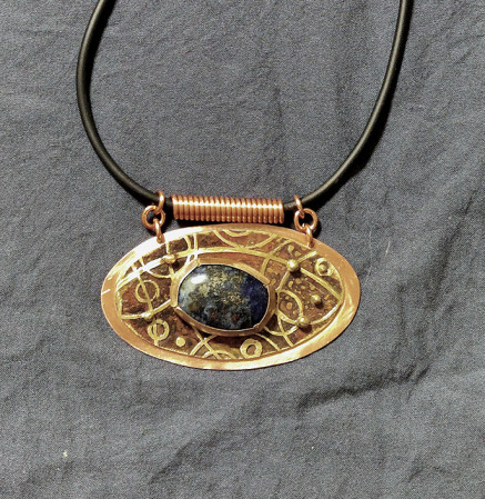Copper, etched bronze, Lapis Lazuli stone, granulation, patina. Another in the series of my Cosmos designs.